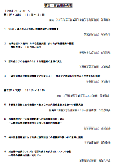 目的:看護に関する日頃の研究成果を発表し意見の交換を行い、看護の実践に向けて研鑽を深めることにより看護の充実・発展を図る。