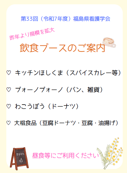後日、飲食ブースについてのご案内をホームページと参加者のマイページに送信いたします。お待ちください。